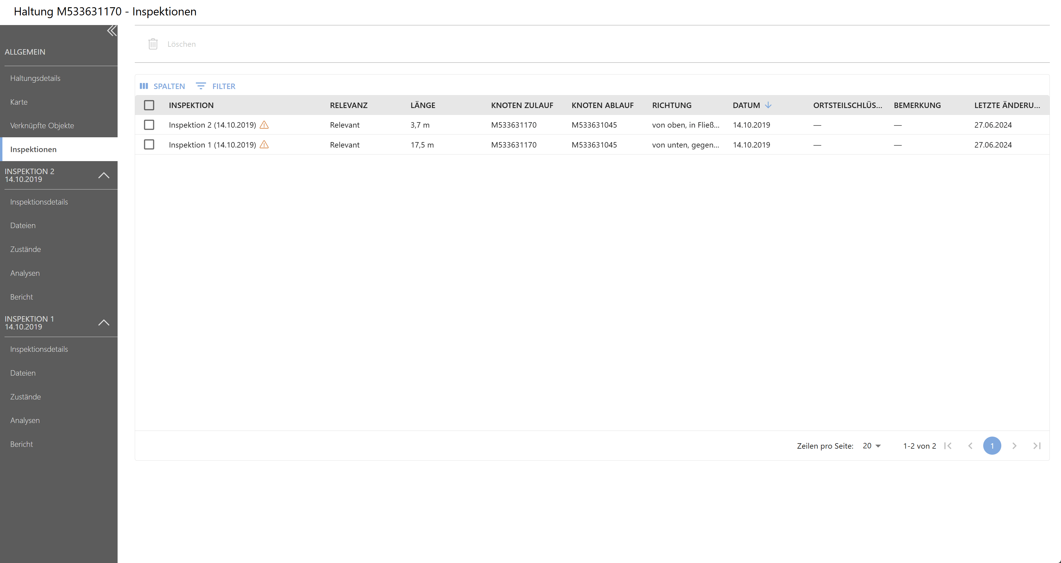 Bei den Inspektionen haben die Nutzer die Möglichkeit, die genauen Inspektionsdetails analog zu den Haltungen einzusehen, jedoch mit anderen Inhalten. Durch die KI-Analyse der Inspektionen werden verschiedene Dateien wie Screenshots, PDFs und Videos abgelegt. Diese Dateien resultieren aus den erfassten Zuständen der Analyse und sind neben dem eigentlichen Bericht als separate Screenshots geführt.